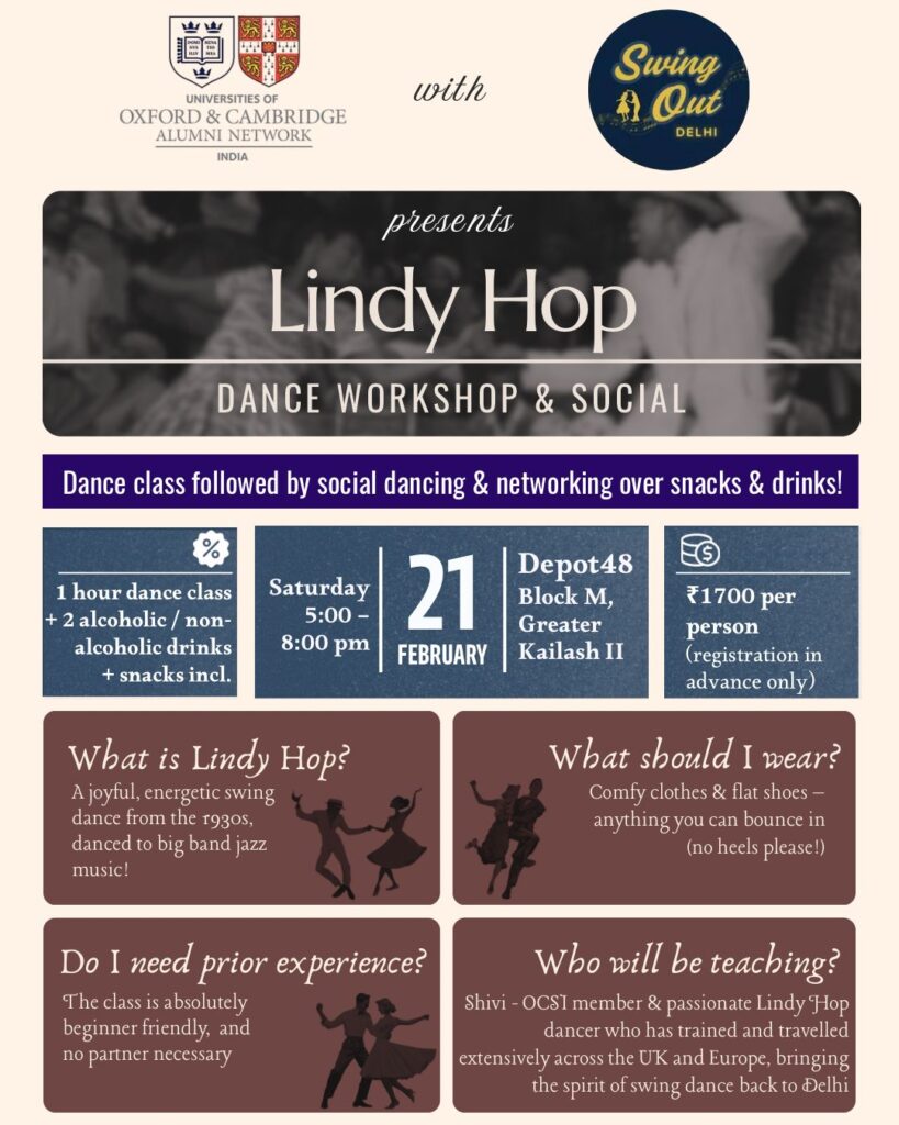 The OCSI, in collaboration with Swing Out Delhi is delighted to invite its Members and their Partners/Spouses to a special Lindy Hop Dance Workshop & Social!
